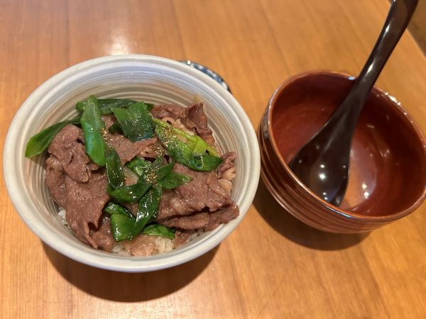 I also ordered a beef rice bowl. Available in regular and small sizes, the bowl was simple, topped with beef and green onions, and had a refined, not overly strong flavor. It was delicious.